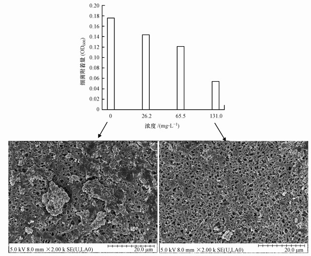 另外, 為了進一步探討雙(3-氨基丙基)胺控制膜表面生物污染的可能性, 將雙(3-氨基丙基)胺投加到溶液通過和懸浮微生物作用之后, 考察微生物在膜表面的附著形態, 分別以靜態附著和動態過濾形式考察.靜態形式培養條件下, 微生物經過不同濃度的雙(3-氨基丙基)胺作用后在聚酰胺膜表面的附著量如圖 3所示.結果顯示, 微生物經過雙(3-氨基丙基)胺處理在膜表面的附著量明顯降低, 而且雙(3-氨基丙基)胺濃度越高, 附著量越少.例如, 經過26.2、65.5及131.0 mg·L-1雙(3-氨基丙基)胺處理后, 微生物在膜表面附著量分別降低了18.38%、31.03%和69.15%.雙(3-氨基丙基)胺顯著抑制了微生物在膜表面的附著, 而且這種抑制效果和雙(3-氨基丙基)胺濃度成正相關.此結果也在SEM中得到證實, 對照組膜表面形成的微生物群落比較致密, 生物膜連成片, 而實驗組膜表面附著的微生物相當稀疏, 有大量的空白區域, 實驗組膜表面附著的生物量要明顯少于對照組膜表面附著的微生物量.