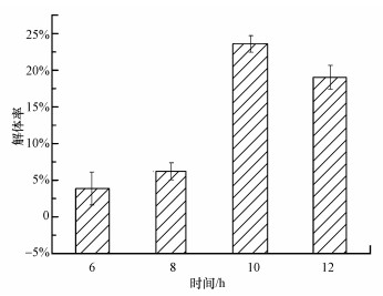 一些傳統的物理化學方法, 如沖刷、消毒劑及紫外線消毒等常被用作生物膜去除, 但由于生物膜中細菌受EPS的保護作用使其對這些常規方法具有一定抗性, 即使高濃度的殺菌劑也很難將生物膜去除.例如, 500 mg·L-1的常規剝離劑也難以剝離成熟的生物膜, 紫外線對生物膜中微生物殺滅能力明顯弱于對懸浮微生物的殺滅作用(王海峰等, 2010).本研究進一步對小分子物質雙(3-氨基丙基)胺能否引起成熟生物膜解體進行探討.131.0 mg·L-1雙(3-氨基丙基)胺對于預培養12 h的生物膜解體效果如圖 5所示.由圖得出, 雙(3-氨基丙基)胺處理生物膜6~12 h后, 生物膜量相對于對照組下降了3.87%~23.59%, 由此可以說明雙(3-氨基丙基)胺對生物膜解體有一定的促進作用.這對于控制生物膜, 降低微生物安全風險具有重要的意義.