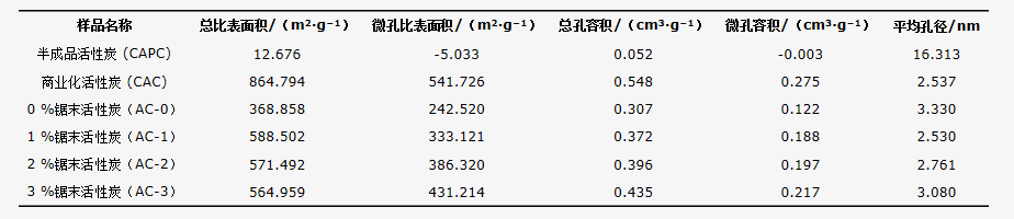 表1 污泥活性炭性質