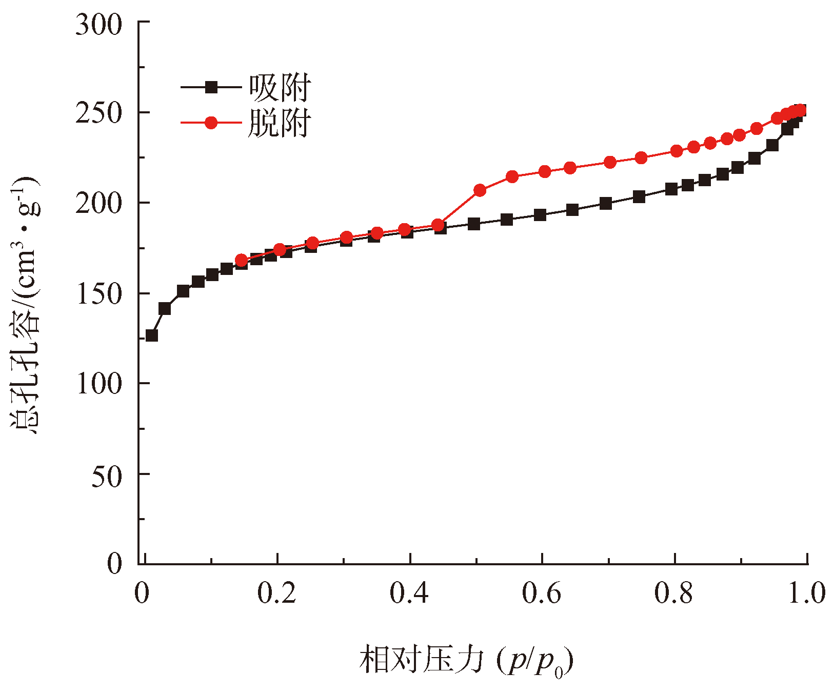 圖3為1 %鋸末添加的樣品活性炭的N2吸附-脫附等溫線。低p/p0區曲線凸向上,在較高p/p0區,N2 在介孔中出現了毛細管凝聚效應,等溫線迅速上升后趨于平坦。在相對壓力接近1之后,N2 在大孔上吸附,曲線上升。由于毛細管凝聚,在0.45~0.95之間出現了吸附-脫附滯后回線,脫附等溫線在吸附等溫線的上方,具有明顯的IV型吸附脫附曲線特征。