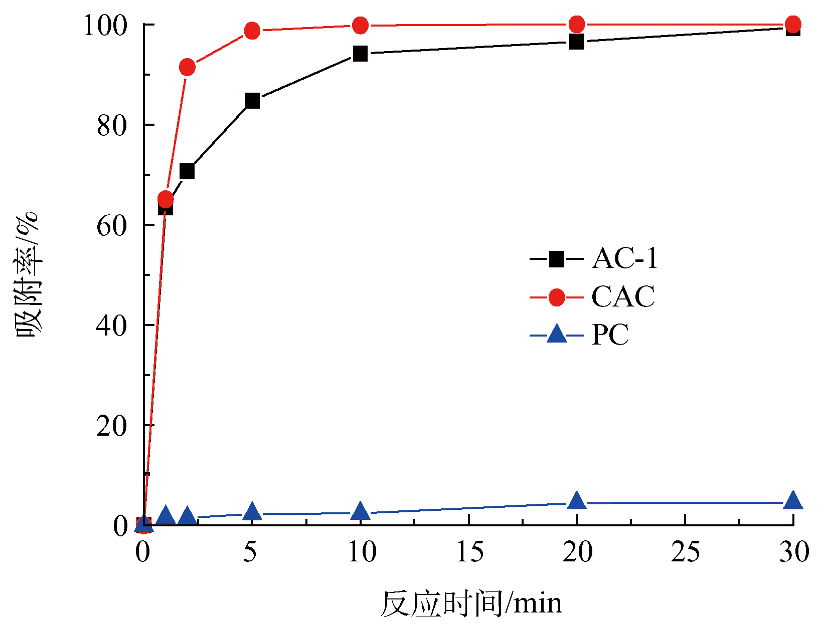 將40 mg所制備的污泥活性炭樣品投入到50 mL亞甲基藍溶液(初始濃度為20 mg·L−1,反應溫度25 ℃,初始pH = 6)中,考察不同吸附材料(商業化活性炭(CAC)、熱解炭渣(PC)、污泥活性炭(AC-1))對亞甲基藍的吸附性能。如圖4所示,可以看出商業化活性炭的吸附效果最好,反應10 min可以將亞甲基藍吸附完全,AC-1在30 min對亞甲基藍吸附率達到99.3%;直接熱解產生的炭渣在30 min的吸附率僅為4.5%。說明活性污泥制備的活性炭相對于直接熱解產生的炭渣具有較大的優勢和實用價值。