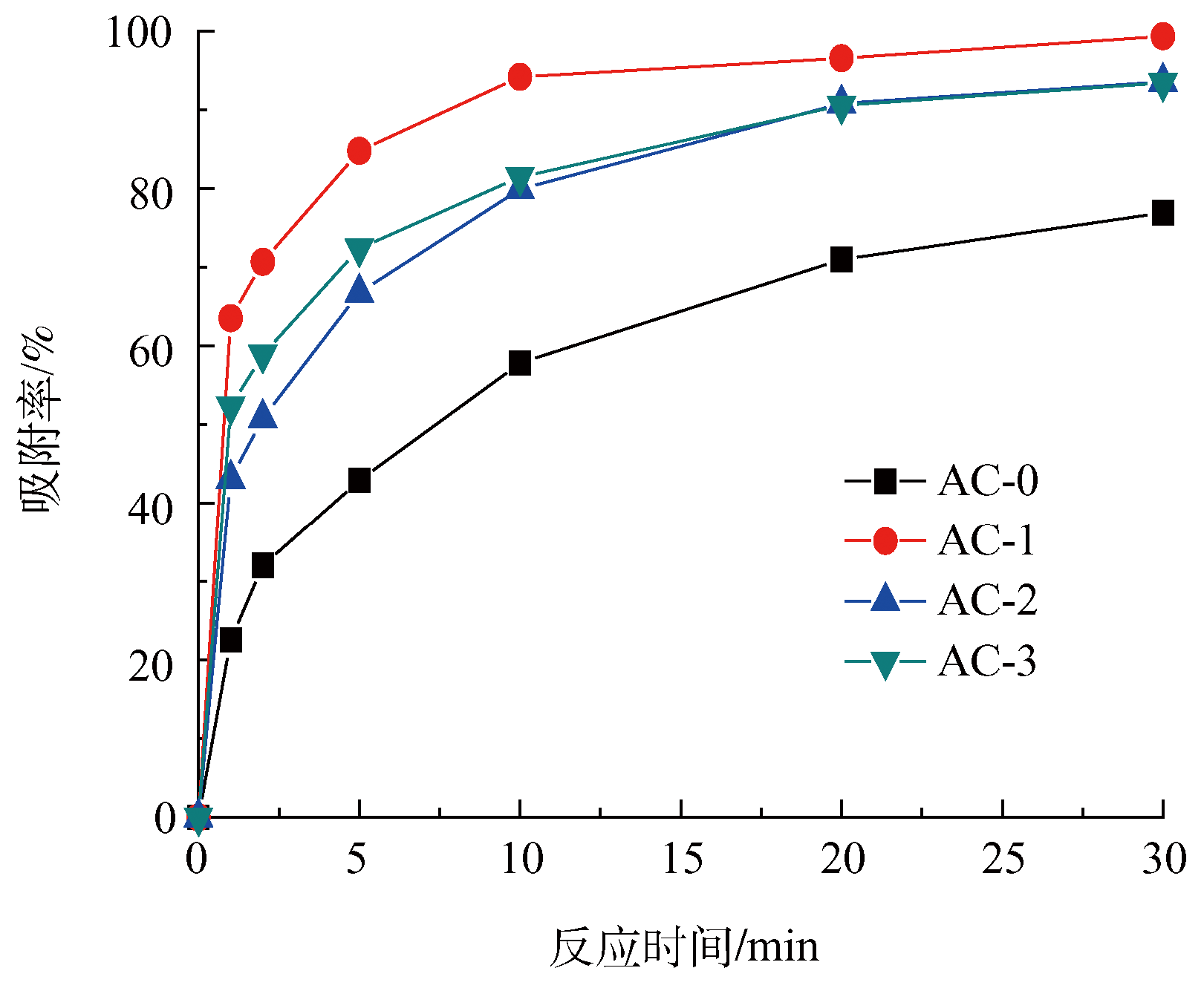 將40 mg所制備的污泥活性炭樣品投入到50 mL亞甲基藍溶液(初始濃度為20 mg·L−1,反應溫度25 ℃,初始pH = 6)中?疾觳煌從┨砑拥幕钚蕴(AC-0、AC-1、AC-2、AC-3)對亞甲基藍的吸附性能。如圖5所示,AC-0在30 min內對亞甲基藍的吸附率僅為76.9%,而AC-1在30 min內對亞甲基藍的吸附率為99.3%。這是因為鋸末的添加可以提高活性炭的含碳量,從而改善其吸附性能[23]。然而,AC-2和AC-3對亞甲基藍的吸附率約為93%,說明過量的鋸末添加反而會影響活性炭的吸附性能。相較于AC-1、AC-2、AC-3的微孔比表面積和孔容均有所提高,總的比表面積卻略微有所下降,說明中孔和大孔在污泥活性炭中占的比例降低,導致亞甲基藍在孔道中傳質阻力增加,從而降低了對亞甲基藍的吸附作用。因此,1%鋸末的活性炭對亞甲基藍吸附性能最好。