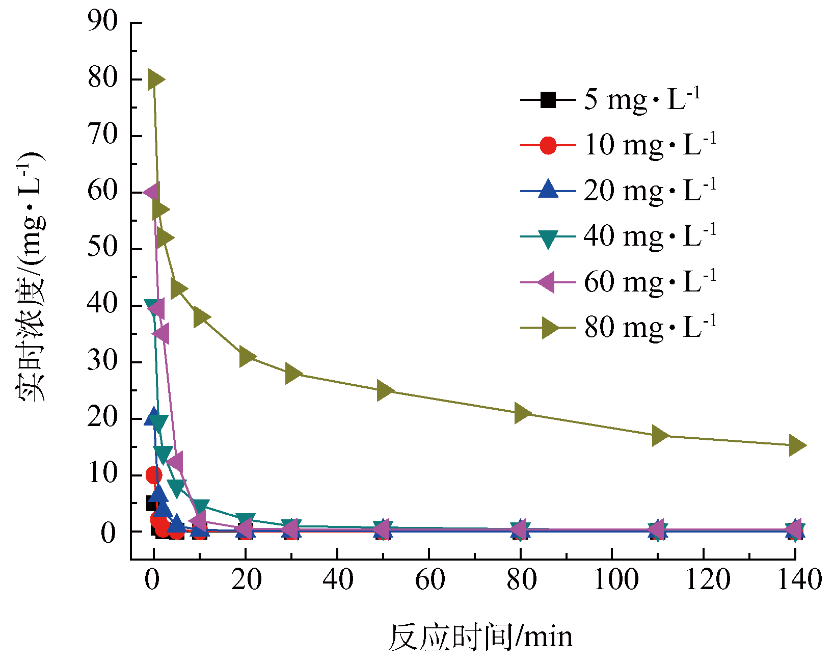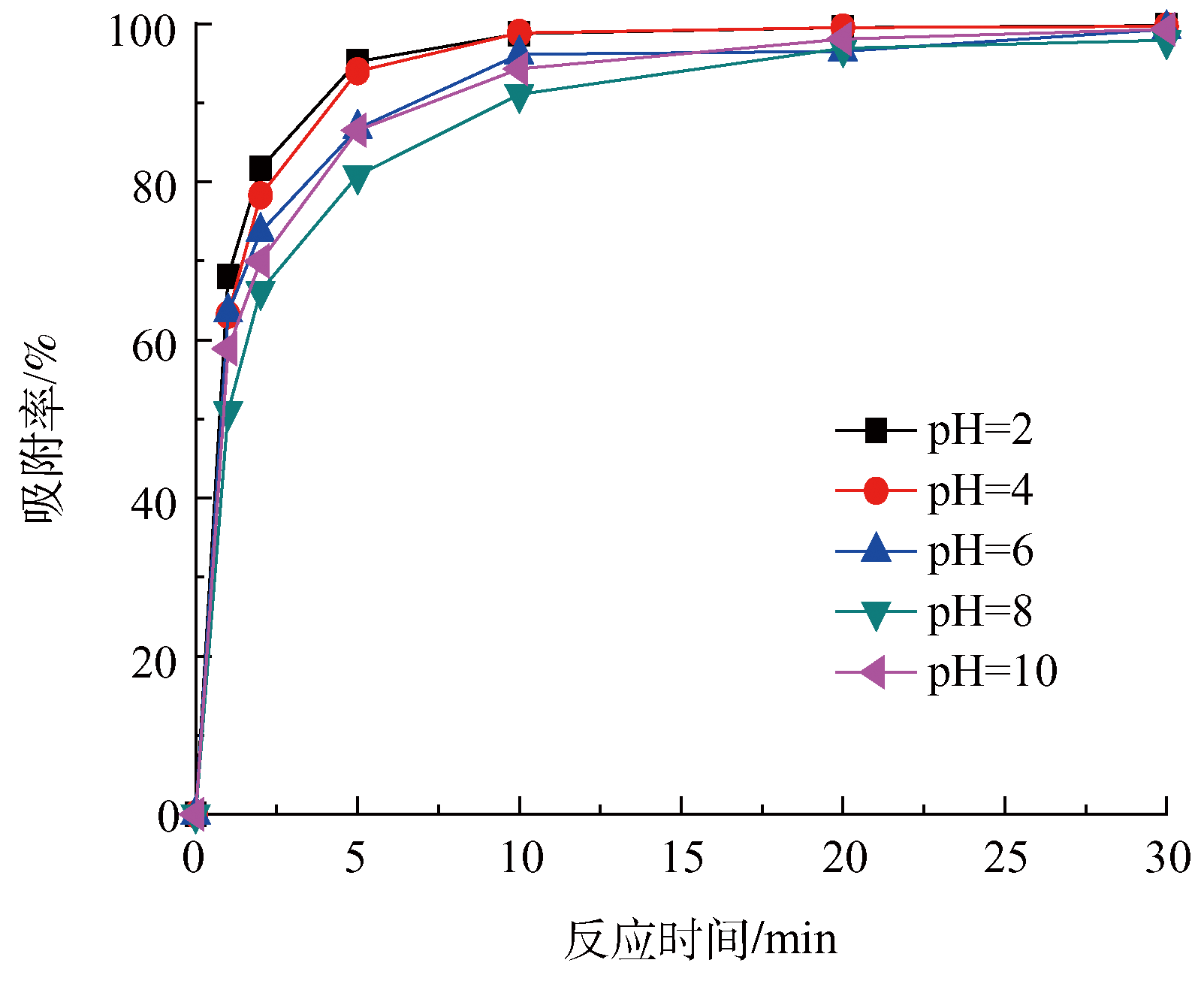 在不同初始pH條件(pH= 2, 4, 6, 8, 10)下,考察污泥活性炭對亞甲基藍(樣品量40 mg,濃度20 mg·L−1,反應溫度25 ℃)的吸附性能。如圖6所示,在不同pH條件下,30 min內污泥活性炭對亞甲基藍均有較好的吸附效果。但是隨著pH的升高,亞甲基藍的吸附速率有所降低;钚蕴勘砻嬗写罅康暮豕倌軋F(如—OH,C=O或—COOH等),它們作為吸附位點與亞甲基藍發生吸附作用。當溶液pH升高,OH−與活性炭表面的含氧官能團發生競爭吸附,導致對亞甲基藍(陽離子染料[23])的吸附減弱。具體聯系污水寶或參見http://www.bnynw.com更多相關技術文檔。