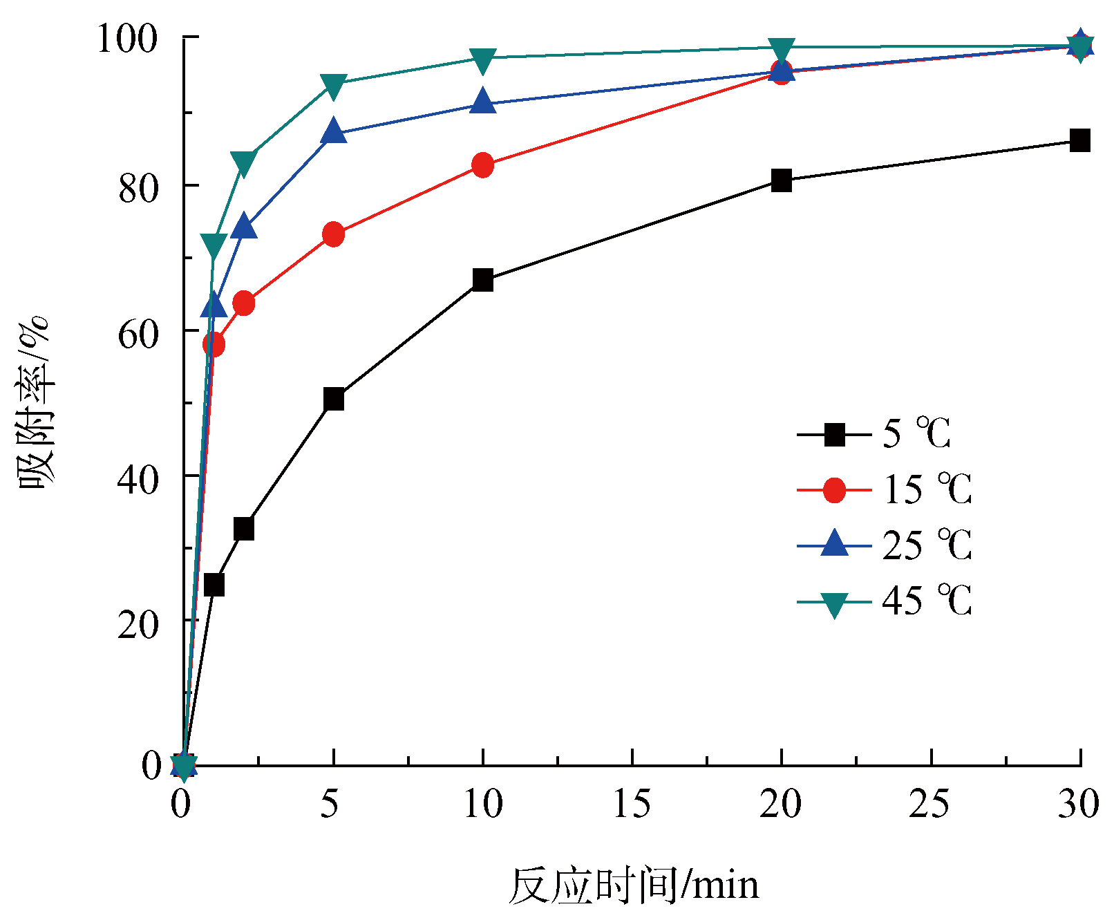將40 mg所制備的污泥活性炭樣品投入到50 mL亞甲基藍溶液(初始濃度為20 mg·L−1,初始pH = 6)中,考察不同反應溫度(5, 15, 25, 45 ℃)對污泥活性炭吸附亞甲基藍的影響。如圖7所示,溫度對污泥活性炭的吸附性能的影響較大。隨著反應溫度的升高,污泥活性炭對吸附亞甲基藍的吸附效率明顯提高。吸附反應一般是放熱過程,所以只要達到了吸附平衡,升高溫度會使吸附量下降。但在低溫時,有些吸附過程短時間內達不到平衡,而升高溫度會使吸附速率加快,并出現吸附量增加的情況。溫度為45 ℃時,污泥活性炭對亞甲基藍的吸附效率最高,但在實際應用中,吸附反應溫度很難達到45 ℃,所以本實驗并未考慮高于45 ℃的情況。因此反應溫度選定為25 ℃。