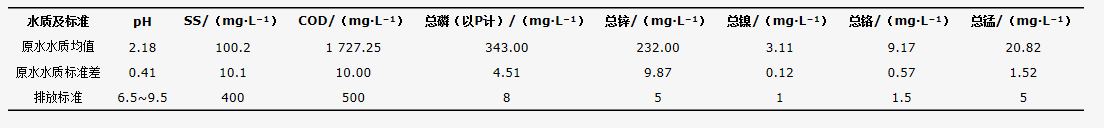涂裝廢水是在汽車、自行車、鋼鐵配件等涂裝生產過程中排放的廢水,主要來源于酸洗、脫脂、表調、磷化、電泳、噴涂等工序。據統計,我國每年自行車噴涂工藝產生的廢水大約為35億 t,每年汽車噴涂工藝產生的廢水大約為80億 t。涂裝廢水水質復雜,COD含量高(一般為1 200~2 000 mg·L−1),可生化性差(BOD5/COD<0.3),且酸性強(pH=1.5~3.0),含有大量鐵、鎳、錳、鋅、Cl−、SO42−等多種無機污染物,如鋅離子濃度為250~300 mg·L−1,為了滿足后續生化處理對進水水質的需求和日益嚴格的排放標準,涂裝廢水通常采用中和沉淀法進行處理。