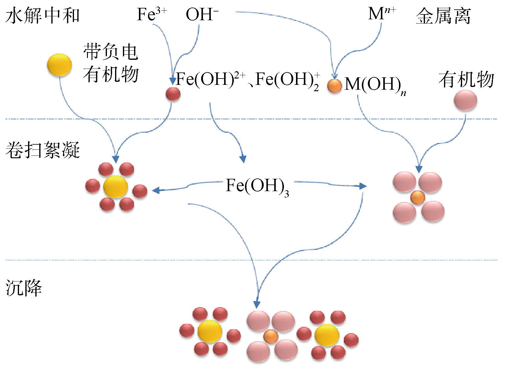 在pH高于8時,有機物的去除主要是氫氧化物絮體對有機物的吸附作用、電性中和作用和卷掃網捕作用共同影響的結果。不同的pH下,Fe3+與OH−結合可以形成Fe(OH)2+、Fe(OH)2+、Fe(OH)3,上述3種物質可以通過電性中和和卷掃網捕作用去除廢水中的有機物,具體的作用過程如圖4所示。在pH=8時,COD的去除率最高,這可能是由于這幾種機制共同作用,效果達到最佳。對于Fe(OH)2+、Fe(OH)2+、Fe(OH)3等的電性中和和卷掃網捕作用,SHEN等對不同條件下Fe(III)中Fe3+、Fe(OH)2+、Fe(OH)2+、Fe(OH)3所占的比例進行研究,結果表明,pH為2.18時,廢水中Fe3+和Fe(OH)2+是Fe(III)的主要成分,pH為4時,廢水中Fe(OH)2+和Fe(OH)2+是Fe(III)的主要成分,pH為6~8時,廢水中Fe(OH)2+和Fe(OH)3是Fe(III)的主要成分,pH在10~12時,廢水中Fe(OH)3是Fe(III)的主要成分。當涂裝廢水pH在2.18~8時,涂裝廢水中Fe(OH)2+、Fe(OH)2+和Fe(OH)3可以通過電性中和和卷掃網捕作用去除廢水中的有機物,少部分有機物也可以吸附在已經形成的金屬氫氧化物表面,導致對COD的去除效果增強,pH從10到12,廢水中Fe(OH)2+、Fe(OH)2+含量減少,電性中和作用減弱,即pH在2.18~8時,COD的去除率增大,pH在8~12時,COD的去除率降低。