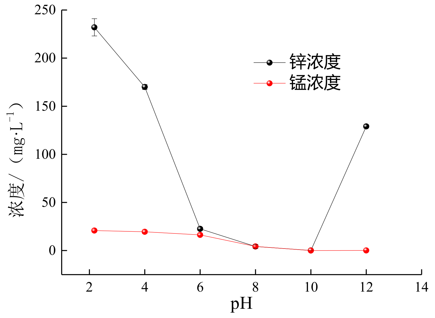 圖8 總鋅濃度、總錳濃度隨pH的變化