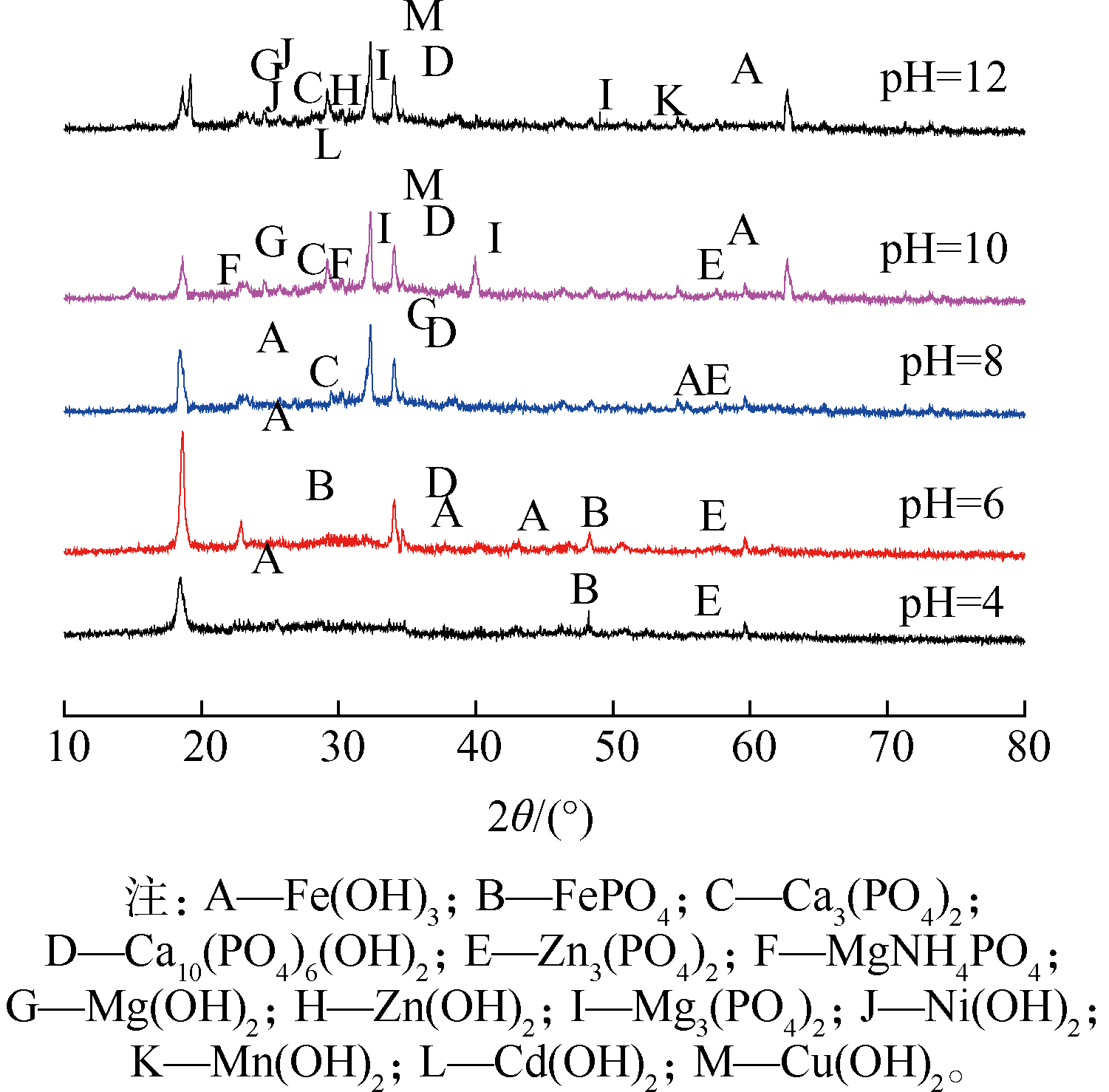 2)總磷的去除主要依賴于金屬離子和PO43−、HPO42−之間的親和力,在pH=2.18~10時,主要生成磷酸鹽沉淀,pH=10~12時,形成的氫氧化物沉淀種類增多,這也是pH=10~12時總磷濃度升高的原因;COD的去除機制隨著pH的變化而有所差異,在pH =2.18~8時,COD的去除主要由于不溶性金屬絡合物的形成、電性中和和卷掃網捕,在pH =10~12時,主要的作用機制為氫氧化物絮體的吸附作用和卷掃網捕;電中和、沉淀物吸附以及MgNH4PO4沉淀形成等是氨氮去除的主要原因;金屬離子的去除機制主要有磷酸鹽沉淀的形成、氫氧化物沉淀的形成、氫氧化鐵沉淀的吸附絮凝作用,同時鋅、鉛等金屬離子為兩性物質,過高pH不利于其去除。