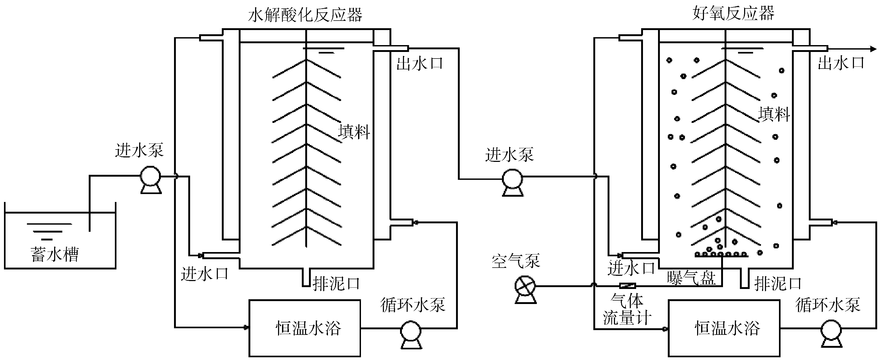 所用的實際印染廢水取自廣州市某針織印染企業調節池。該廢水成分復雜,其中含有多種纖維雜質、堿、染料及助劑等,綜合水質如下:COD 400~700 mg·L−1,氨氮 5~20 mg·L−1,色度 300 倍左右,pH 8.0~9.0,水溫約45 °C,本實驗進水前先冷卻至常溫。