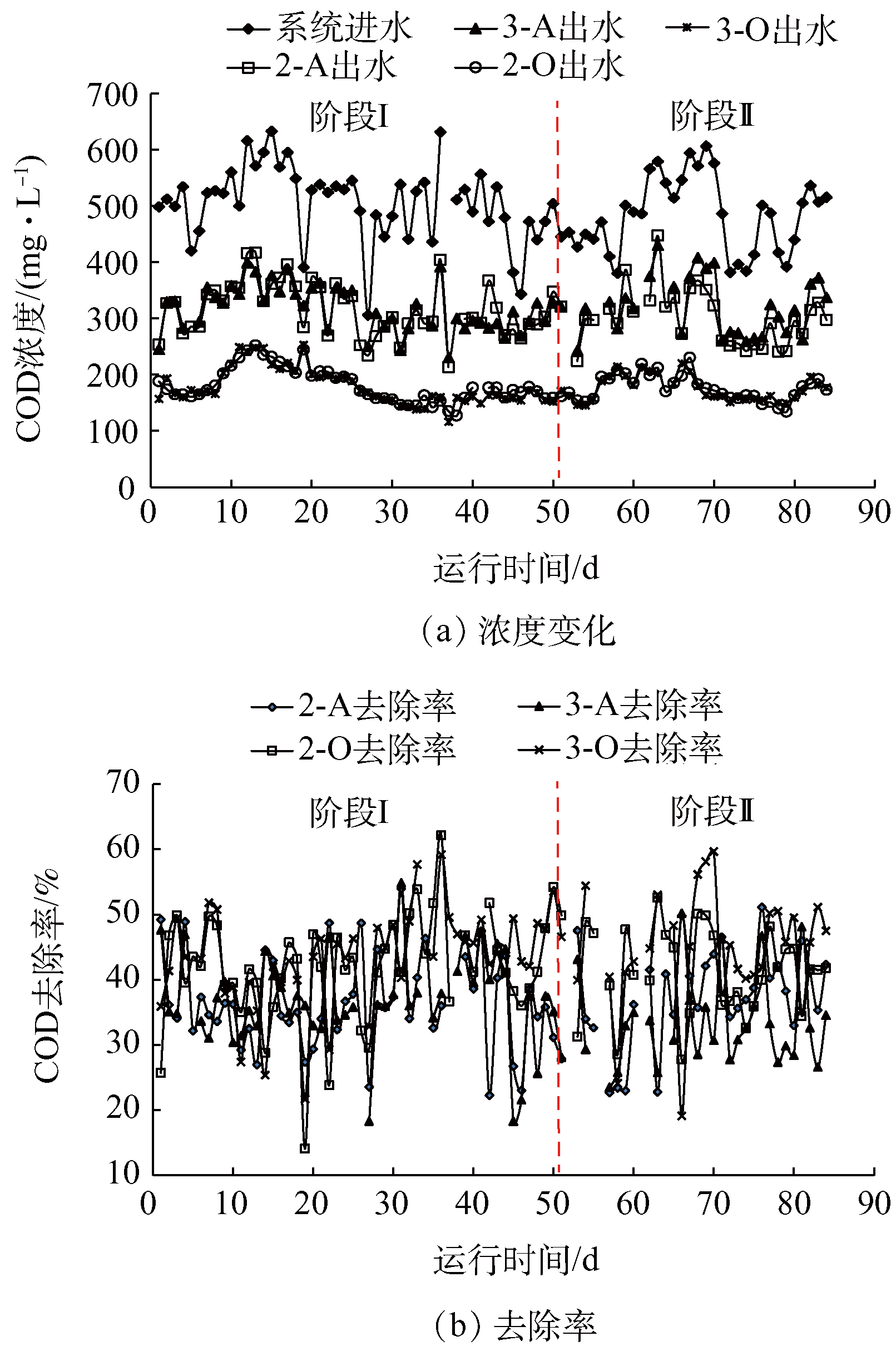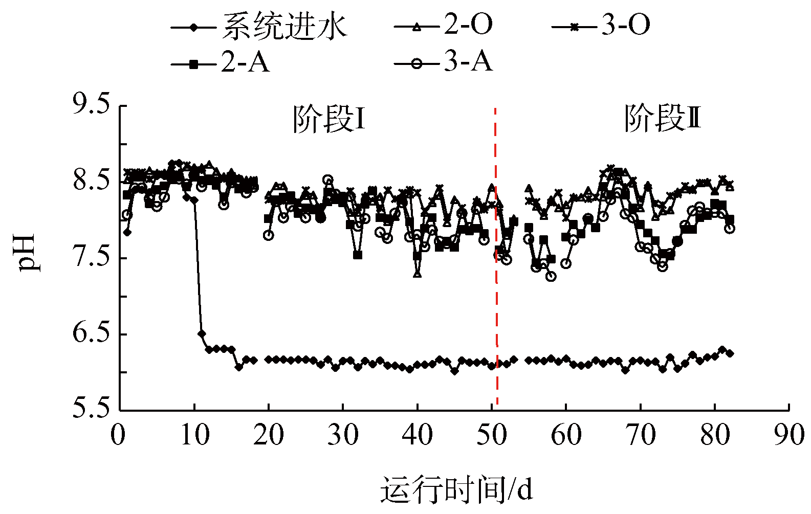 pH是廢水生化處理的重要工藝參數,常規水解酸化工藝適合的pH范圍較寬,一般在6.5~7.5之間[19]。而對于印染廢水生化處理體系,當pH高于微生物等電點時,堿性染料會對微生物的活性造成較強抑制[20]。綜合考慮以上影響,并且為了穩定進水水質,本實驗經過探索實驗后,從第11天開始將進水pH調節為6.0~6.5之間,各體系運行過程中進出水pH變化如圖2所示,在階段Ⅰ和階段Ⅱ運行期間,2-A體系和3-A體系出水pH均分布在7.5~8.6之間,體系內部呈中性偏弱堿性環境,2-O和3-O體系出水相比水解酸化體系均略有升高,為7.6~8.7之間。