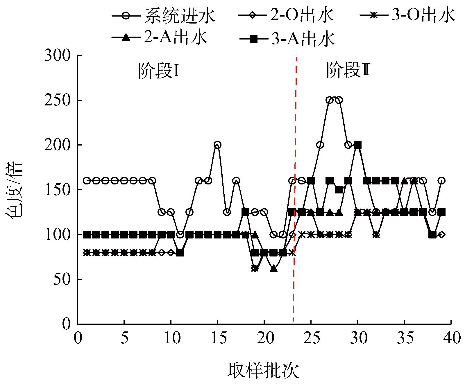從階段Ⅰ第11天開始,用稀釋倍數法定期測定(平均間隔2 d測定1次)各體系進出水色度,結果如圖5所示。階段Ⅱ向3-A投加雙氧水之后,3-A體系出水色度相比2-A體系波動較大,基本在125~150 倍之間,既有高出2-A色度的情況,也有低于2-A色度的情形,但3-O和2-O體系出水色度仍然保持基本相同,在100~125 倍之間。