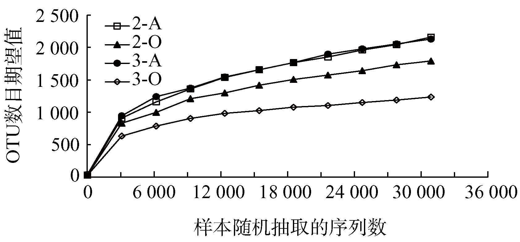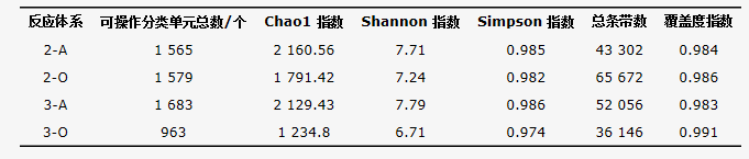 為了更深入地分析雙氧水投加對完全生化處理系統的影響,本實驗在階段Ⅱ運行期間(第70天),分別取雙氧水協同生化體系(3-A,3-O)以及完全生化處理對照體系(2-A,2-O)的污泥樣品,采用宏基因組16S rDNA測序法, 對這些樣品進行微生物聚類與多樣性分析,并對各樣品中的微生物具體種類進行了鑒定和解析。