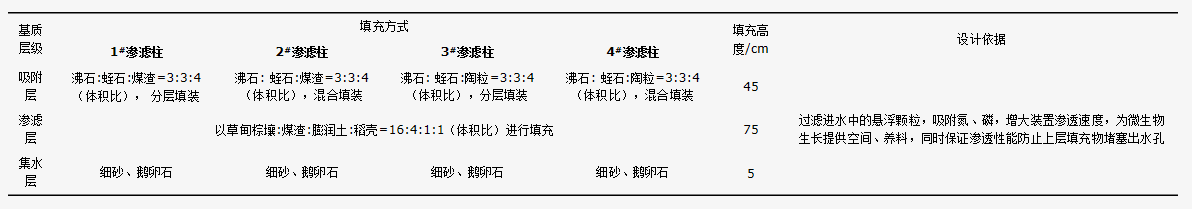 1)通過在吸附層引入沸石、蛭石、煤渣和陶粒4種新基質(zhì),比較基質(zhì)填充方式,改良滲濾層基質(zhì)配比,有效增強了土壤的滲透速度和持水量,提高了對污染物的降解能力。