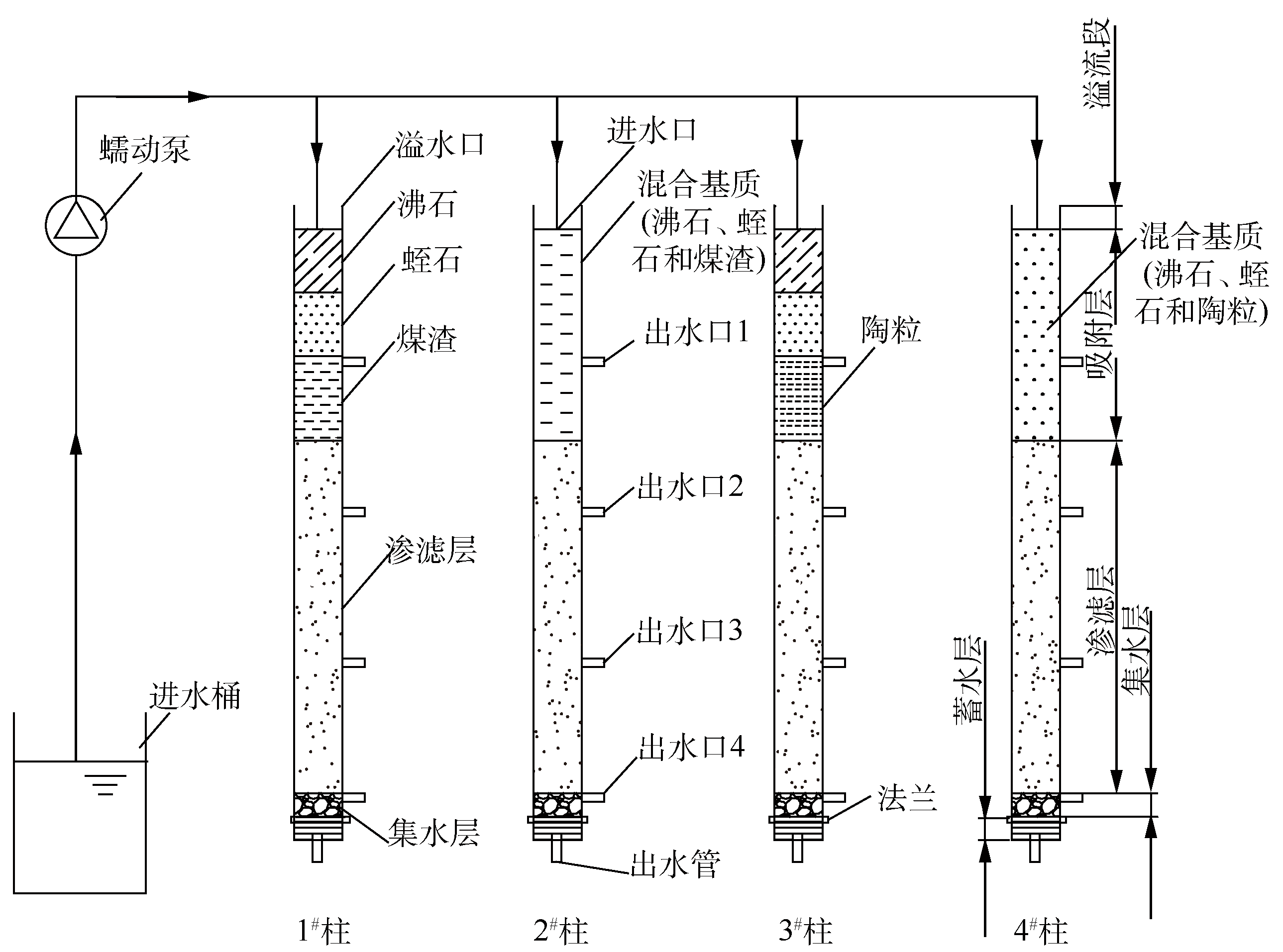 構(gòu)建4套模擬裝置,包括蠕動泵、進(jìn)水桶、滲濾柱等,其中滲濾柱是主體。滲濾柱尺寸:內(nèi)徑Ф10 cm,高h(yuǎn)135 cm;材質(zhì)為有機玻璃,由上、下兩部分組成,中間以法蘭連接,上部是滲濾柱主體,包括基質(zhì)層(高125 cm)和溢流段(高5 cm),柱體頂部設(shè)溢水口,溢水口下5 cm處設(shè)進(jìn)水口,從進(jìn)水口開始每隔30 cm設(shè)1個出水口,共計4個;下部為蓄水層,高5 cm,連接出水管,與上部之間用布滿0.5 cm小孔的有機玻璃隔開。由于磷在滲濾過程中易被介質(zhì)的物理化學(xué)吸附截留,可以認(rèn)為磷在土壤中是幾乎不移動的,滲濾過程中部分氮可被介質(zhì)吸附,其余的可以通過硝化、反硝化作用去除。基于上述理論,基質(zhì)層從上往下依次分為吸附層、滲濾層和集水層,具體填充方式如表1所示,其中吸附層填充基質(zhì)在課題組前期研究的基礎(chǔ)上進(jìn)行配比,裝置如圖1所示。
