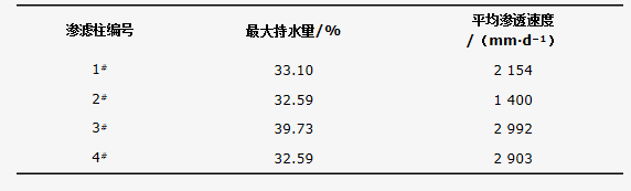 根據(jù)中國氣象局降雨量等級劃分,大暴雨降雨量為100~249.9 mm·d−1。結(jié)合實驗數(shù)據(jù)計算,理論上在大暴雨天氣下,3#滲濾柱能承擔(dān)自身面積11~29倍區(qū)域的雨水滲透。