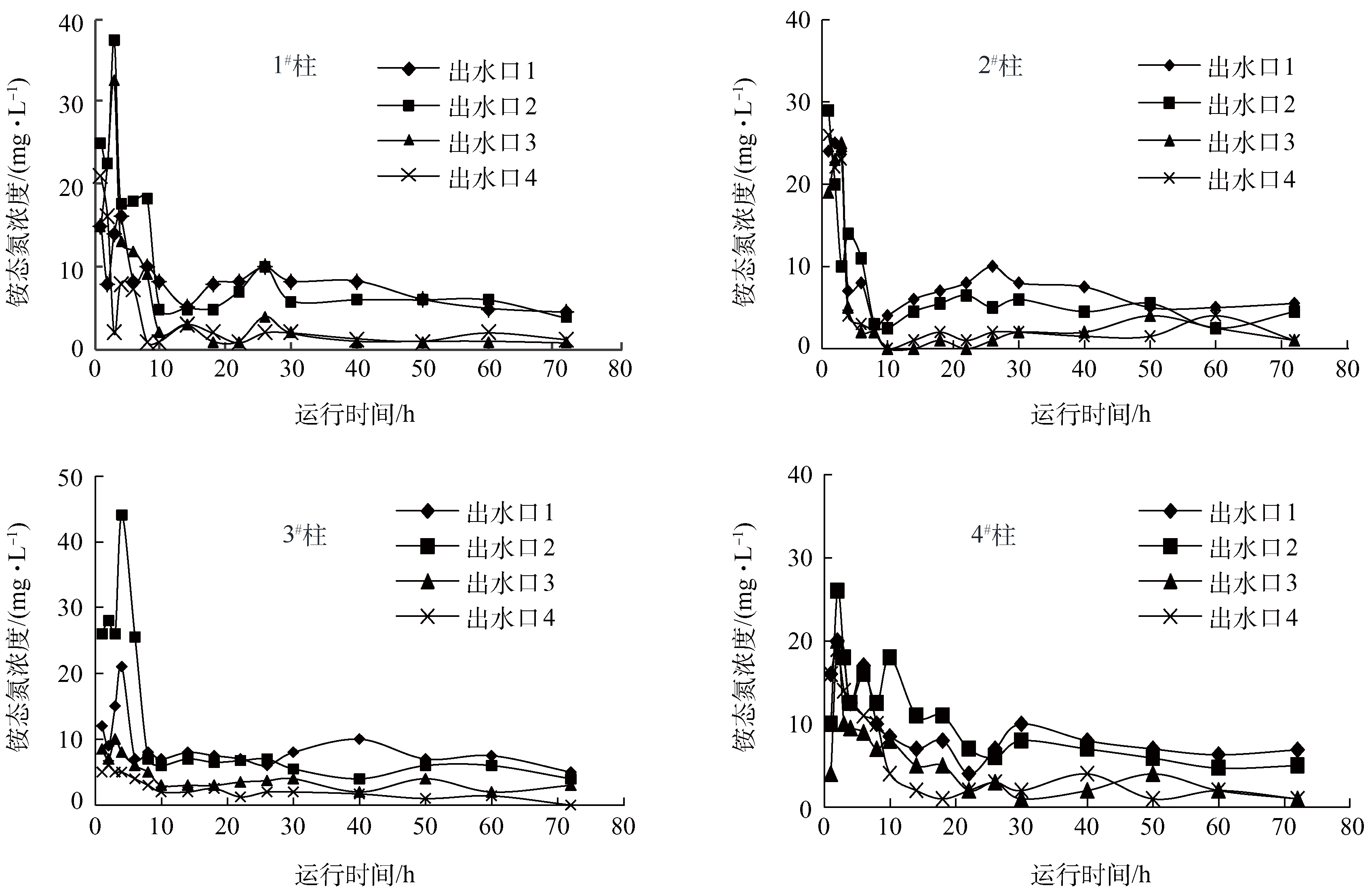 圖2 各滲濾柱不同出水口NH4+-N濃度隨時間的變化