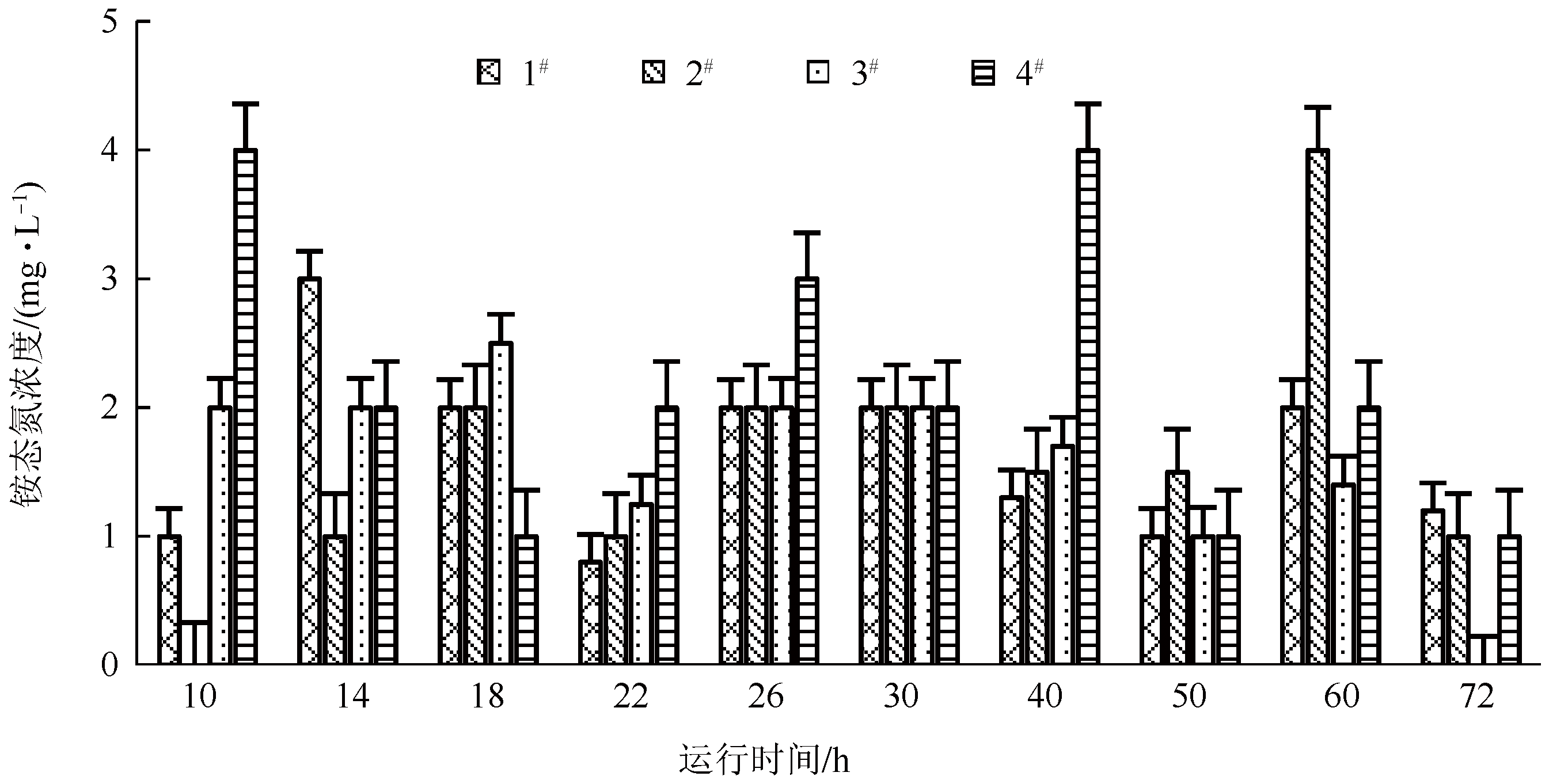 取10 h后滲濾柱最終出水觀察(圖3),4#滲濾柱出水相對較差,平均出水濃度為3.2 mg·L−1,1#、2#和3#滲濾柱出水效果相近,平均出水濃度分別為2.7、2.6和2.7 mg·L−1。此時各滲濾柱出水NH4+-N濃度均小于5 mg·L−1,符合《城市污水再生利用 城市雜用水水質(zhì)指標(biāo)》(GB/T 18920-2002)中道路清掃、消防等各項用水標(biāo)準(zhǔn)和《城鎮(zhèn)污水處理廠污染物排放指標(biāo)》(GB 18918-2002)中一級A類要求。各滲濾柱對NH4+-N的去除率均在80%以上,1#、2#、3#和4#柱的去除率分別為86.68%、84.65%、86.27%和80.13%。