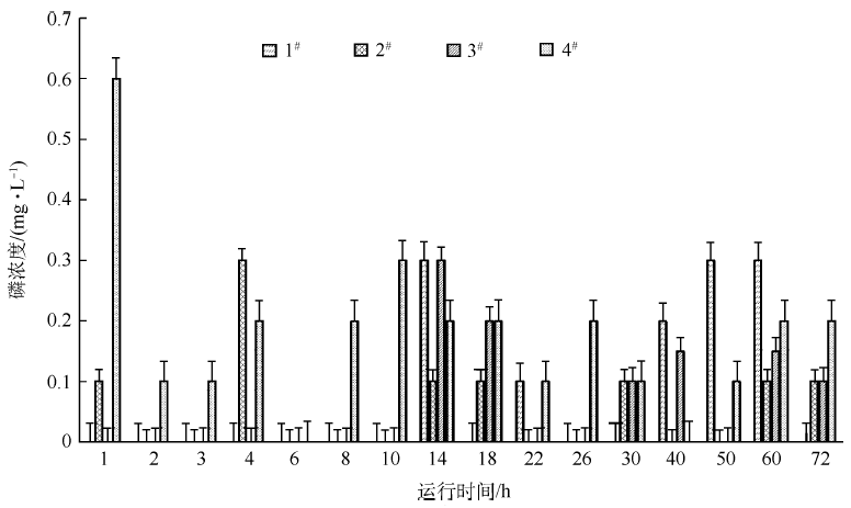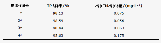 4根滲濾柱中TP濃度隨時間變化如圖4所示,除2#柱在6 h左右有較大波動外,各滲濾柱出水中TP濃度穩(wěn)定。由出水口1可看出滲濾柱上層吸附層對TP有明顯作用,相同填充基質(zhì)中分層填充的吸附效果好于混合填充,不同填充基質(zhì)中沸石+蛭石+陶粒的組合略好于沸石+蛭石+煤渣組合;從上到下各出水口TP逐漸降低,各滲濾柱在出水口3的平均濃度均小于1 mg·L−1,到最終出水口4即基質(zhì)層深120 cm處達(dá)到最佳去除效果。出水口4在各個時間出水如圖5所示,除第1次出水時4#滲濾柱磷濃度較高,其余時間各滲濾柱出水均小于0.3 mg·L−1,各滲濾柱出水平均濃度均小于0.2 mg·L−1,符合《城鎮(zhèn)污水處理廠污染物排放標(biāo)準(zhǔn)》(GB 18918-2002)中一級A類標(biāo)準(zhǔn)。對比進(jìn)水與出水濃度,得出各滲濾柱對TP的平均去除率,如表3所示,均在95%以上;其中4#滲濾柱去除率最低,為95.63%,其余3個滲濾柱對TP的去除率相差不大,均大于98%;2#滲濾柱去除率最高,為98.59%。各滲濾柱TP的平均出水濃度及去除率如表3所示。具體聯(lián)系污水寶或參見http://www.bnynw.com更多相關(guān)技術(shù)文檔。