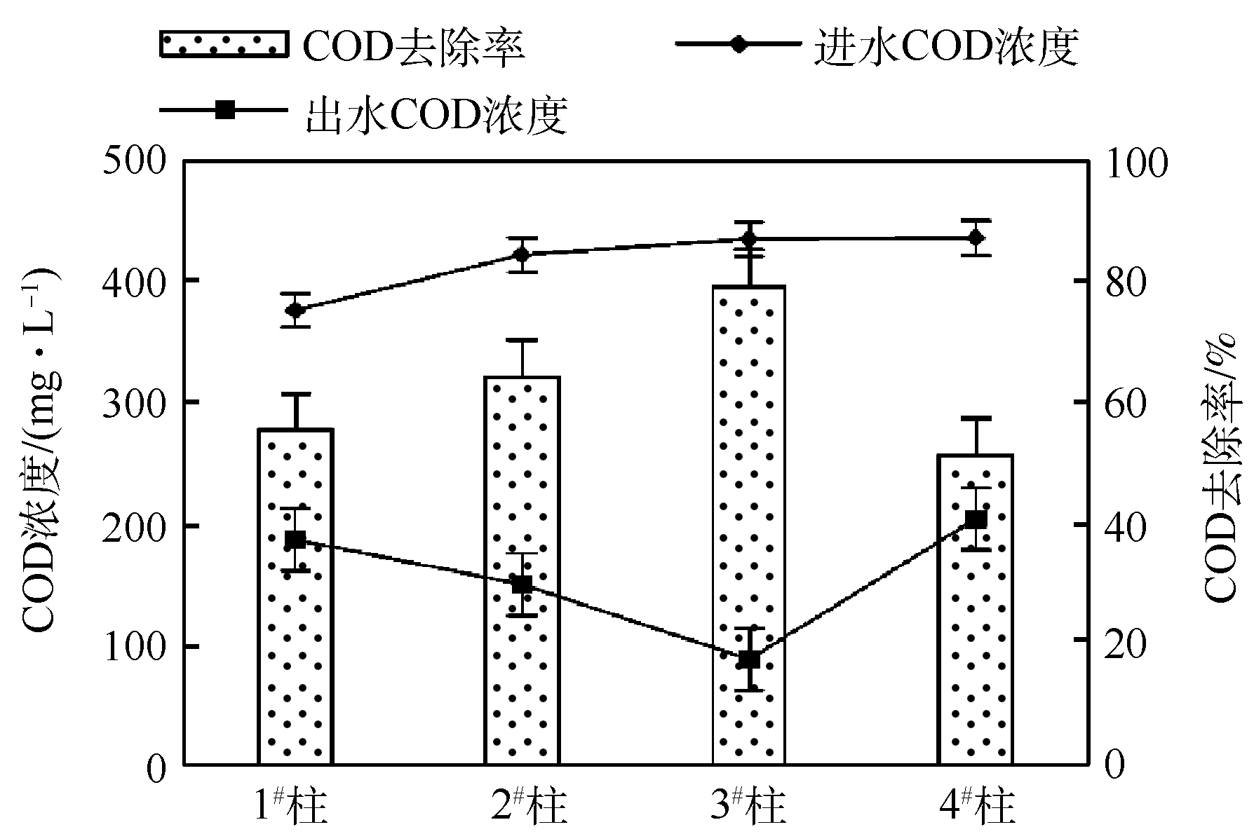 對裝置運行的72 h中進(jìn)水及最終出水口4水質(zhì)COD濃度取平均值,以此計算各滲濾柱對進(jìn)水中COD的平均去除率,結(jié)果如圖7所示,均在50%以上,其中3#柱去除率最高可達(dá)88.75%。