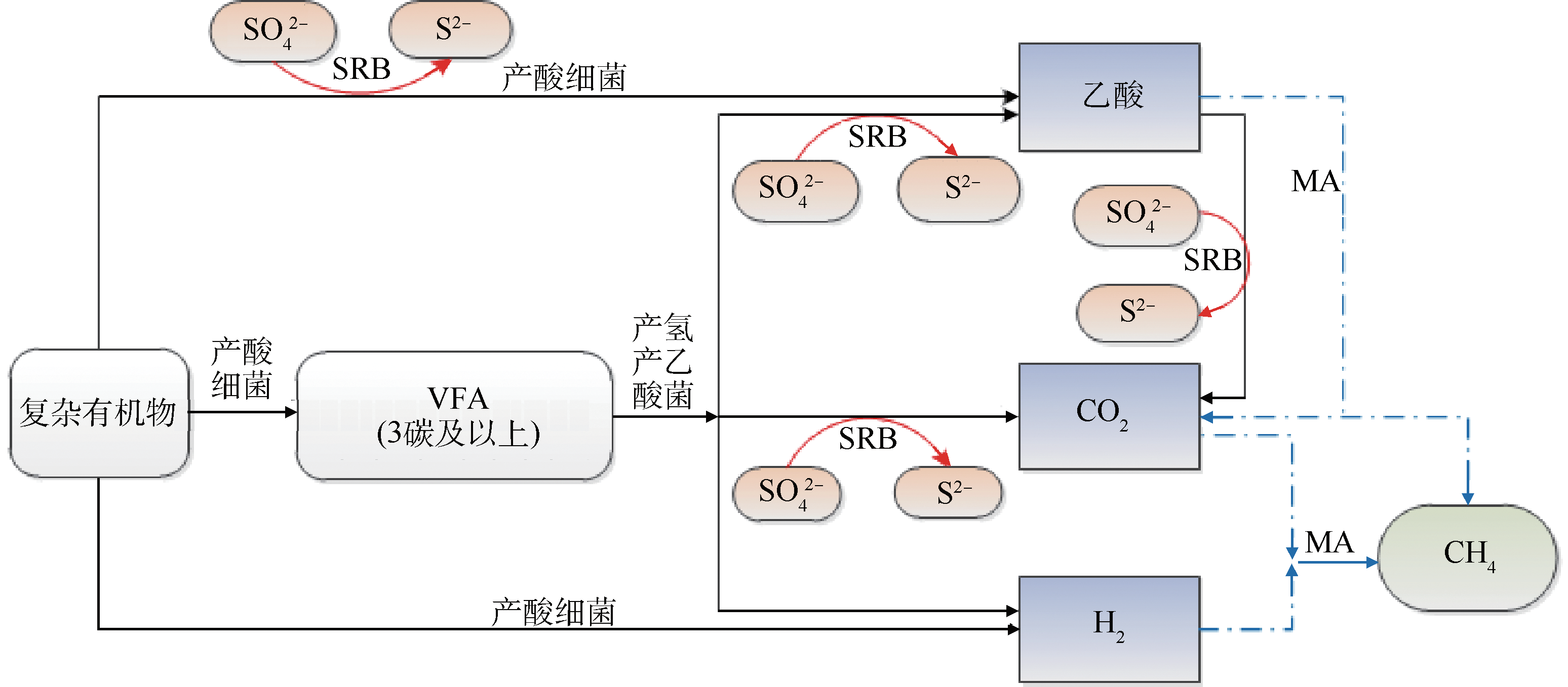 MCCARTNEY等提出碳硫比(COD/SO42−)是決定SRB和MA競爭結果的重要因素。CHOI等認為COD/ SO42−在1.7~ 2.7時,兩者存在強烈的競爭;在此范圍以下,SRB占優勢;此范圍之上,MA為主導。SUN等的研究發現,當硫酸鹽濃度在5~30 mg·L−1范圍內時,提高硫酸鹽濃度可以增加最大硫化物產生速率、降低最大甲烷產生速率。
