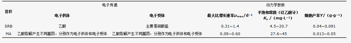從可利用的基質范圍來看,MA只能利用乙酸、H2、CO2和一碳有機物(如甲醇),而SRB是代謝譜較寬的廣食性微生物。乙酸和氫氣都可以被SRB、MA所利用,但由于70%以上的甲烷來自于MA對乙酸的分解,因此乙酸在MA對SRB的競爭關系上是尤為重要的底物。從動力學角度看,當SRB與MA均以乙酸為基質時,SRB的最大比增長速率和底物親和力更高(見表4)。研究表明,SRB利用電子供體的優先順序是乳酸、丙酸、丁酸、乙酸,氫營養型SRB對硫酸鹽的親和力也遠大于乙酸營養型SRB,因此乙酸營養型SRB在SRB總菌群中的相對優勢并不明顯。GUISASOLA等的實驗結果顯示,硫酸鹽還原過程僅利用了38%的乙酸鹽。