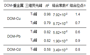 式中, F0和F分別為DOM添加重金屬前后三維熒光圖中相關峰的熒光強度, M為金屬溶液的濃度, n為被金屬離子配位的結合位點(熒光基團的比例), K為條件穩定常數(絡合常數).