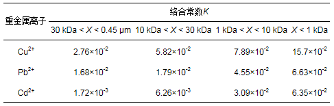 利用雙對數回歸曲線方程(1)對超濾后4個不同分子量(X)區間的DOM組分與3種重金屬離子之間的絡合作用進行擬合, 求出二者之間的絡合常數K, 結果如表 3所示.