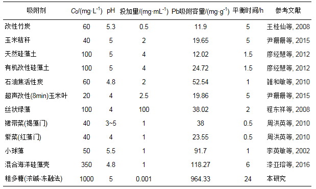本研究對采用濃堿-凍融方法從混合海洋硅藻中提取的粗多糖對Pb2+的吸附能力與其他藻類吸附劑對Pb2+的吸附能力進行了比較, 結果如表 4所示.