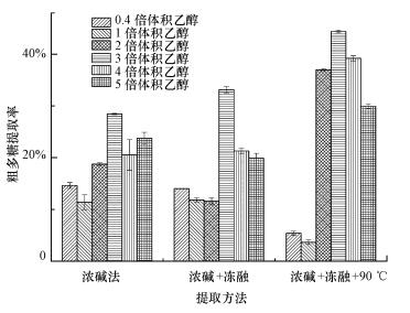 每種方法的料液比均為1:30 (g:mL)、反應4 h(Davis et al., 2003;Yun et al., 2003;Raize et al., 2004), 在4000 r·min-1下離心20 min, 得到的上清液加熱濃縮至原體積的1/4, 去除溶液中的蛋白質, 采用乙醇分級沉淀提純法, 考察其在3種提取過程中對粗多糖得率的影響.以此前的上清液加熱濃縮后的液體體積為基準, 設定乙醇體積為0.4、1、2、3、4和5倍.沉淀后的物質冷凍干燥得到粗多糖干粉為淡綠色粉末(含有大量的色素和小分子雜質).