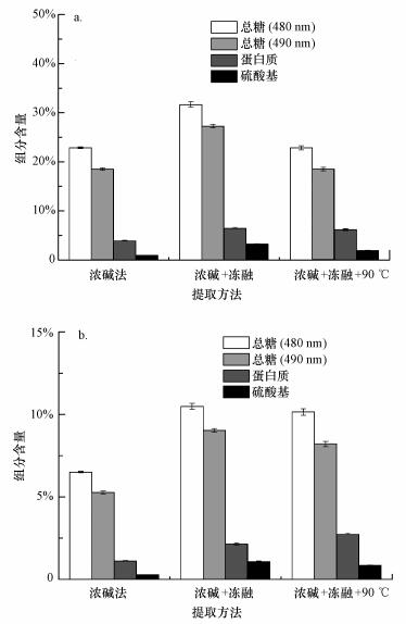 綜合粗多糖得率與單位質量粗多糖的成分結果計算出單位質量藻粉提取出的物質組成成分, 結果如圖 2b所示.結果表明, 濃堿-凍融法的單位質量硅藻干粉中提取的總糖含量和硫酸基多糖含量較高, 相比于其它方法具有優(yōu)勢.