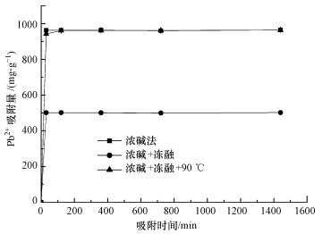 不同提取方法得到的粗多糖含有的官能團有差異, 提供孤對電子與金屬離子絡合或離子交換的可能性不同, 而且粗多糖中雜質亦可能不同.本研究比較了濃堿-凍融、濃堿法及濃堿-凍融-90 ℃ 3種方法對Pb2+的吸附性能, 結果如圖 3所示.由圖可知, 濃堿-凍融、濃堿法兩種提取方法得到的粗多糖樣品對Pb2+的吸附量明顯高于濃堿-凍融-90℃方法, 在初始Pb2+溶液濃度為1 mg·mL-1時, 濃堿-凍融法對Pb2+的去除率達到98.34%, 接近100%, 其吸附量為983.35 mg·g-1.這表明加熱反應可能破壞了多糖表面的某些官能團, 降低了對Pb2+的吸附.同時, 凍融與否對于粗多糖吸附Pb2+無明顯影響.因此, 綜合考慮粗多糖得率及對Pb2+的吸附效果, 利用濃堿-凍融法提取得到的粗多糖樣品進行Pb2+吸附試驗.