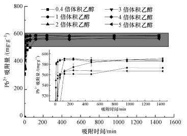在同一種提取方法下, 不同的乙醇體積沉淀所獲得的粗多糖不同.圖 4顯示了濃堿-凍融法在不同倍體積無水乙醇沉淀下獲得的粗多糖對Pb2+的吸附結果.由圖可知, 反應迅速達到吸附平衡, 在初始Pb2+濃度為0.6 mg·mL-1時, 3倍乙醇沉淀后對Pb2+的吸附量達到最大, 為591.36 mg·g-1, 去除率為98.56%, 接近100%.因此, 利用濃堿法-凍融法3倍乙醇沉淀后得到的粗多糖樣品進行后續(xù)的吸附試驗.