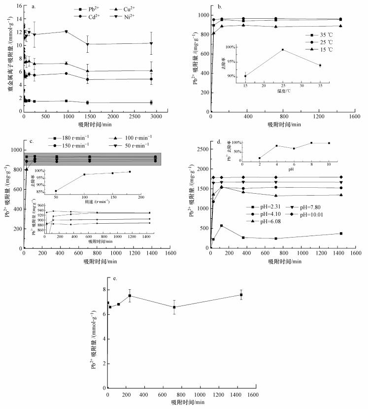 轉速:搖床轉速對Pb2+吸附速率的影響如圖 5c所示.隨著轉速加快, 金屬離子在吸附劑中的擴散加快, 增大了與吸附劑表面積的接觸吸附基團, 有利于吸附反應的進行, 達到吸附平衡的時間越短.