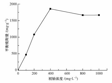 初始濃度可以提供金屬離子克服水溶液與固體物質傳質阻力的動力, 因此, 初始濃度對吸附具有一定的影響.實驗中分別設置Pb2+初始濃度為100、200、400、800、1000 mg·L-1, 考察不同的反應初始濃度對溶液中Pb2+吸附的影響, 結果如圖 7所示.在相同反應條件下, 隨Pb2+初始濃度的增大, 粗多糖對Pb2+的吸附量逐漸增大, 當初始濃度為400 mg·L-1時達到最大值, 但去除率逐漸降低(Ofer et al., 2003).由于投加相同量的粗多糖, Pb2+初始濃度越大, 與吸附劑接觸的機率越大, 吸附劑對Pb2+的吸附量就越大.當初始濃度升高至一定濃度時, 吸附量不再發(fā)生明顯變化, 這是由于吸附劑表面已接近吸附飽和狀態(tài).