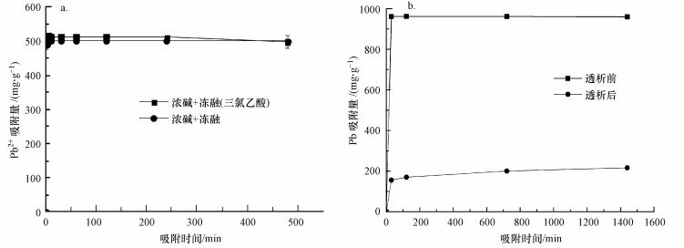 三氯乙酸可去除混合液中絕大部分的蛋白質雜質, 本文考察了去除蛋白質和小分子雜質前后粗多糖對Pb2+的吸附性能, 結果如圖 9所示.結果表明, 蛋白質雜質去除與否對該粗多糖吸附Pb2+不產(chǎn)生明顯影響(圖 9a);而透析后得到的藻水混合液的顏色變淡, 去除絕大部分小分子雜質(如植物色素、無機離子及糖類)后, 得到的粗多糖樣品對Pb2+的吸附明顯下降(圖 9b), 對Pb2+去除率由95.08%下降到21.62%, 但吸附容量仍保持在200 mg·g-1的水平.這說明粗多糖中小分子多糖對Pb2+的吸附具有一定貢獻, 但起主要貢獻的是粗多糖樣品中的低聚寡糖等小分子或無機鹽雜質.