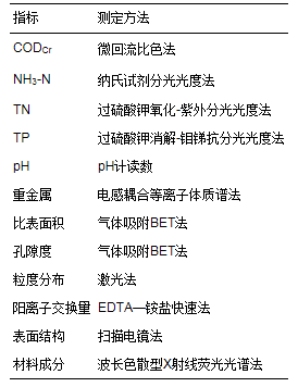 本試驗(yàn)中對(duì)吸附材料的基本理化性質(zhì)、滲濾液CODCr、NH3-N、TN、TP及重金屬進(jìn)行了測(cè)定, 具體測(cè)定方法如表 5所示, 滲濾液中污染物指標(biāo)的檢測(cè)方法均依據(jù)《水和廢水監(jiān)測(cè)分析方法》(第四版), 其他理化性質(zhì)監(jiān)測(cè)均依據(jù)相應(yīng)的國(guó)家標(biāo)準(zhǔn).