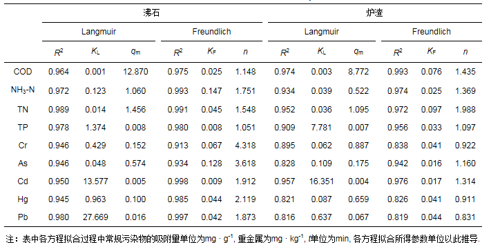 動(dòng)力學(xué)二級(jí)方程對(duì)于沸石和爐渣吸附各種污染物的擬合效果均較好(表 7), 擬合所得平衡吸附量qe(cal)與實(shí)測(cè)值qe(exp)相近.這說明對(duì)污染物的吸附作用既有表面、孔內(nèi)擴(kuò)散的物理作用, 也包含離子交換等化學(xué)作用, 但整個(gè)吸附過程以化學(xué)反應(yīng)為主.