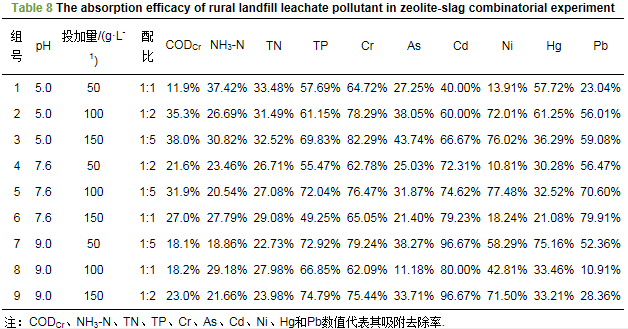 表 8對(duì)比了正交實(shí)驗(yàn)條件下沸石-爐渣組合材料對(duì)垃圾滲濾液污染物的吸附去除效果.由于爐渣自身特性的影響, 沸石對(duì)于NH3-N和TN的去除效率沒有得到很好的發(fā)揮, 組合材料去除氮元素的效果沒有得到最大程度的提升.而組合材料對(duì)磷元素的去除效率有了較大的改善, 對(duì)重金屬的去除效果也保持了爐渣的高性能.材料配比為1 : 5、pH值為5、吸附劑投加量為150 g · L-1時(shí), 污染物去除效果較好, 但各因素水平間的變化對(duì)試驗(yàn)結(jié)果并不顯著, 故在實(shí)際中, 考慮運(yùn)行成本及操作性可選取pH為自然值及投加量為50 g · L-1的條件下進(jìn)行反應(yīng).