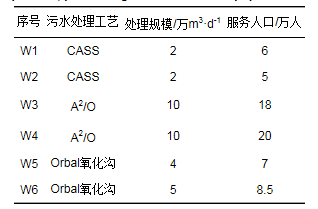 表 1 6個污水處理廠處理工藝、處理規模以及服務人口