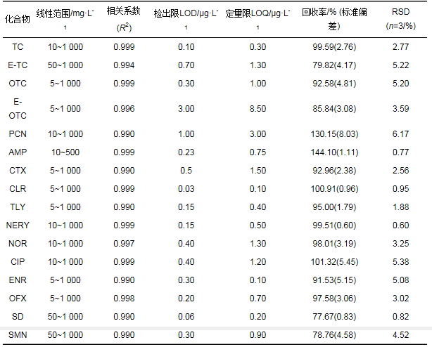 分析方法驗證的結果見表 3, 16種抗生素的相關性系數均R2≥0.99.根據此方法確定了16種抗生素的加標回收率范圍為77.67%±0.83%~144.10%±1.11%.除E-TC、SD和SMN的回收率分別為79.82%、77.67%和78.76%以外大部分抗生素的回收率都在80%以上.