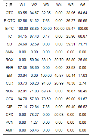 所檢出的其他抗生素種類與城市污水處理廠對比, 所含抗生素種類相似. CTX在W3中、PCN和AMP在W2中有檢出, 但含量都很低, PCN、AMP和CTX都屬于β-內酰胺類抗生素, 這可能是由于β-內酰胺類抗生素的化學性質不穩定, 此類化合物結構最不穩定, 容易與酸、堿以及重金屬等作用時, 易發生水解和分子結構重排[25].