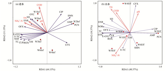 污水處理廠中氨氮(NH4+-N)、總氮(TN)、化學需氧量(COD)、pH等是監測水質的基本參數, 而且這些指標的高低也在影響著抗生素的濃度值[26].對進出水中抗生素的含量和基本水質參數進行相關性分析發現, 在進水中[圖 3(a)]W3和W6廠中四環素類抗生素(E-OTC、E-TC、TC)和大環內酯類(CLR、EM、ROX)濃度相對較高, W1和W5廠中SD、OTC、ENR、OFX濃度相對較高, 并且以上抗生素與水質的COD、TN、NH4+-N、pH均呈正相關關系, 而β-內酰胺類抗生素與4種水質參數呈負相關關系, 小城鎮污水處理廠的進水較復雜, 除人用抗生素外, 可能還存在一些周邊養殖場使用的獸用抗生素. OTC和SD濃度較高, 并且養殖廢水是高COD、NH4+-N廢水, 這兩種抗生素和COD、NH4+-N有較強的相關性.在出水中[圖 3(b)]可以看出W1、W3、W5廠SD、OTC、ENR、NOR、OFX等都存在, 并且和COD、NH4+-N均有較強的相關性, 這些抗生素隨著污水處理廠的排水一起進入到環境中, 對環境造成了潛在耐藥性威脅.