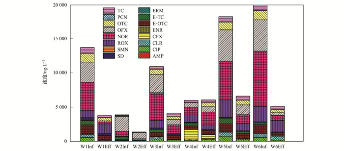 Inf: 進水, Eff:出水, 下同圖 2 6個污水處理廠進出水抗生素的濃度總量