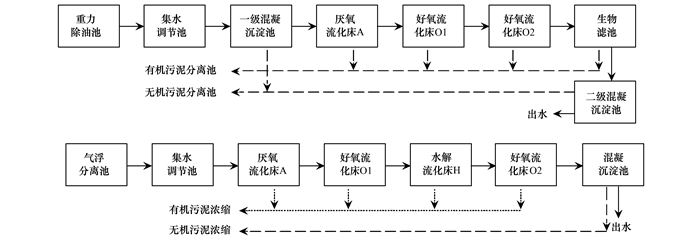 廣東韶關寶鋼集團韶鋼公司焦化廢水處理廠一期A/O2工藝流程圖和二期A/O/H/O工藝流程圖如圖 1所示, .其中, A/O2工藝已經穩定運行12 a, A/O/H/O工藝已經穩定運行9 a.根據兩期工程采樣時間時的進水負荷, 對于生物處理系統, A/O2工程進水為焦化廢水原水經過洗滌水、地坑排水、反沖洗水等的稀釋, 日處理水量約為1 500 t·d-1, 干污泥排放量約為7 t·d-1; A/O/H/O工程進水為未經稀釋的焦化廢水原水, 日處理水量約為1 000 t·d-1, 干污泥排放量約為9 t·d-1.