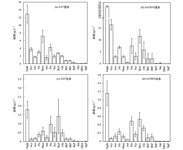 2 結果與討論2.1 兩種工藝的進水、出水的PAHs濃度分析