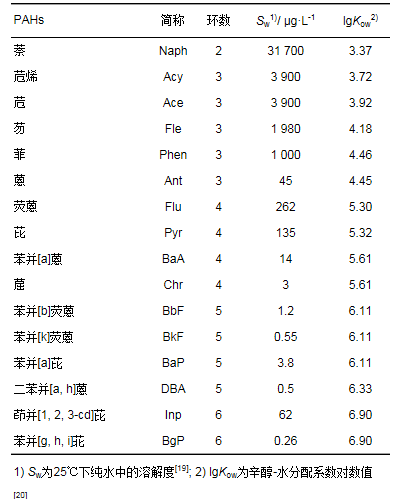 PAHs的定性定量分析采用GC-MS內標法, 其分析條件為:GC-MS(Agilent 7890A, 5975C), HP-5MS石英毛細管柱(30 m×0.25 mm×0.25 μm); 載氣:氦氣; 流速為1 mL·min-1; 進樣口溫度250℃; 電子能量70 eV, 質量掃描范圍60~640 u; 離子源溫度230℃; 升溫程序為:5℃·min-1上升至310℃, 在300℃保持10 min; 進樣量為1 μL; 不分流進樣.