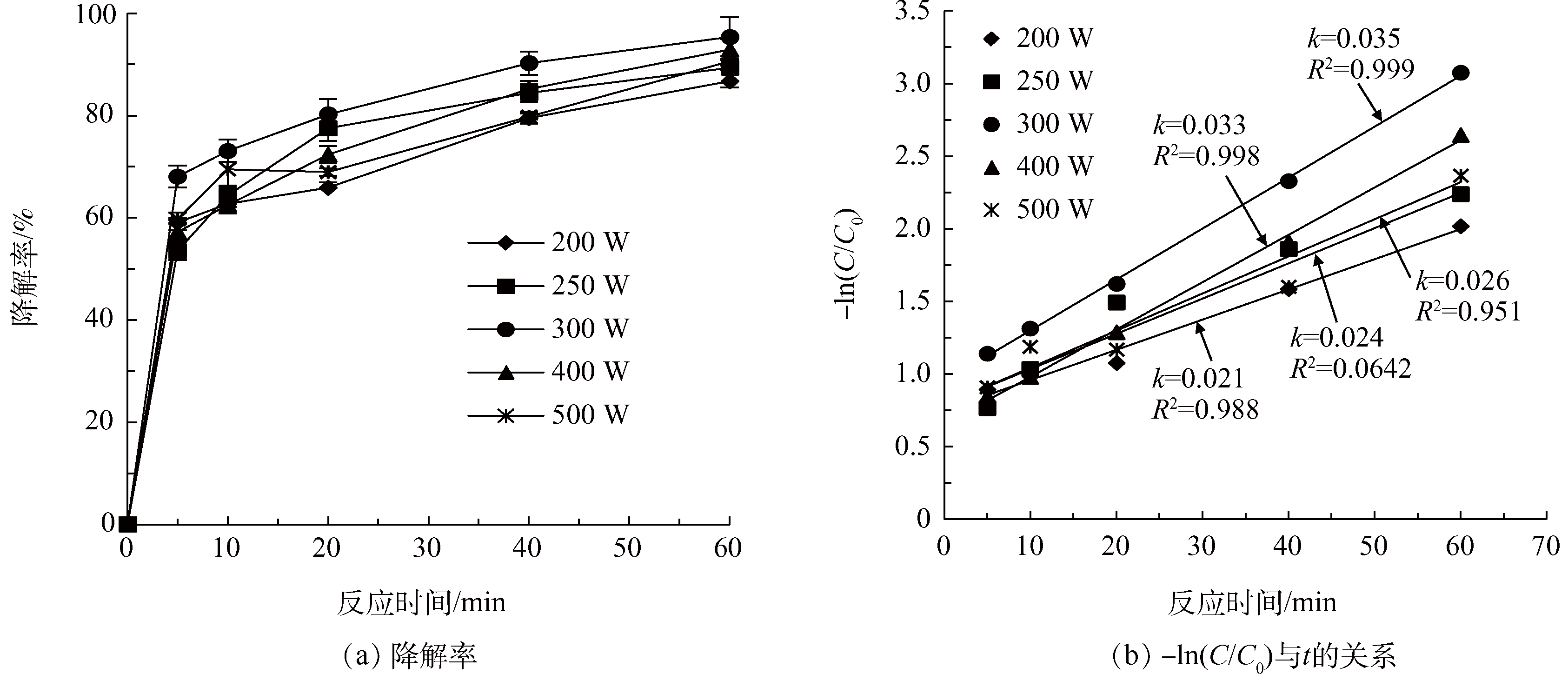 H2O2投加量為36 mmol·L−1,H2O2:Fe2+=10:1,pH為3.0,溫度為30 °C,考察不同超聲強度(200、250、300、400、500 W)對US/Fenton降解Phe的影響,結果如圖4所示。反應60 min后,當超聲功率從200 W增加到300 W時,Phe的降解率從86%增加到95%,而k從0.019 min−1增加到0.35 min−1;當超聲功率大于300 W之后,Phe的降解率從95%降低到68.4%,而k也從0.035 min−1減少到0.012 min−1。隨著超聲的變化,降解率有所變化,說明了超聲對Fenton有一定的促進作用。分析其原因,由于超聲波產生空化效應,隨著聲能密度增加,空化效應也越劇烈,進而溶液中產生更多空氣氣泡和·OH,促進Phe的降解;當超聲功率增加到一定程度后,聲能密度不斷加大,致使空化泡沒有足夠時間破裂,進而空氣泡在聲波的負壓相里不斷增大,從而形成超聲屏障,抑制Phe的降解。戴麗雅等的研究也表明,超聲功率為250 W時,超聲芬頓對COD的降解最佳。陳穎等[12]的研究也發現,超聲功率為120 W時,超聲/芬頓法對準好氧礦化垃圾反應床出水COD去除率最高。因此,最佳超聲功率為300 W。