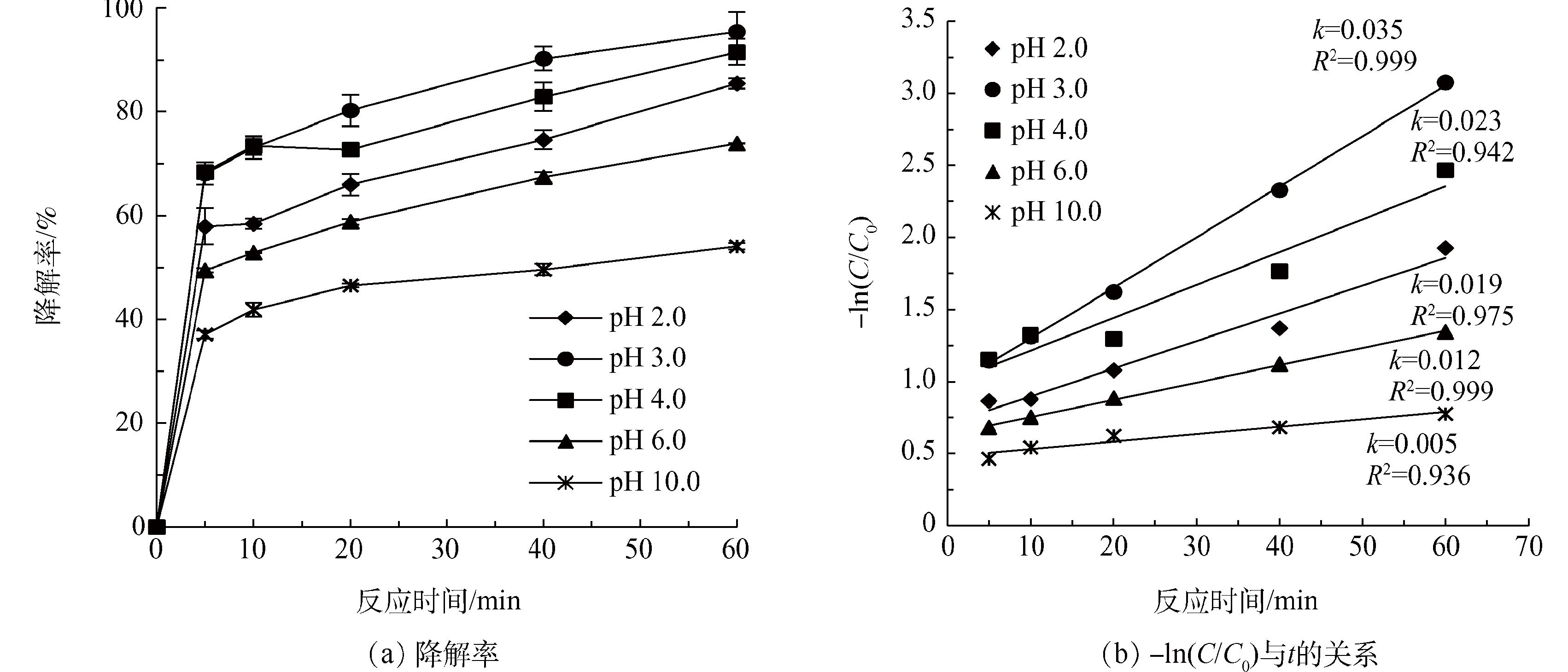 在超聲強度為300 W,H2O2投量為36 mmol·L−1,H2O2:Fe2+=10:1,溫度為30 °C,考察pH(2.0、3.0、4.0、6.0、10.0)對US/Fenton降解Phe的影響,結果如圖5所示。Phe的降解率隨pH升高而減少。pH由2.0增加到3.0時,降解率從85.4%增加到95%,降解率達到最大值。而pH>3.0時,隨著pH的增大,降解率逐漸減小,最小為54.1%。從圖5(b)可知, k也呈現相似的規律:pH為3.0時,k最大,為0.035 min−1;在pH由2.0升至3.0時,k由0.019 min−1增加到0.035 min−1;而弱酸至堿性條件下,pH繼續升高,pH=10.0時,k降低至0.005 min−1。說明在酸性條件下,Phe降解效果最佳,堿性條件不利于Phe的降解。在李婷等[5]的研究中,發現在酸性條件(pH=3)下,PAHs的降解率最高。因為pH過低,會抑制Fe2+的再生,從而影響了·OH的生成;在中性或者堿性條件下,Fenton體系中的Fe3+會生成Fe(OH)3沉淀,消耗了Fe3+,Fe2+的再生受影響,從而抑制Phe的降解。所以,pH=3.0為US/Fenton降解水中Phe的最佳pH條件。