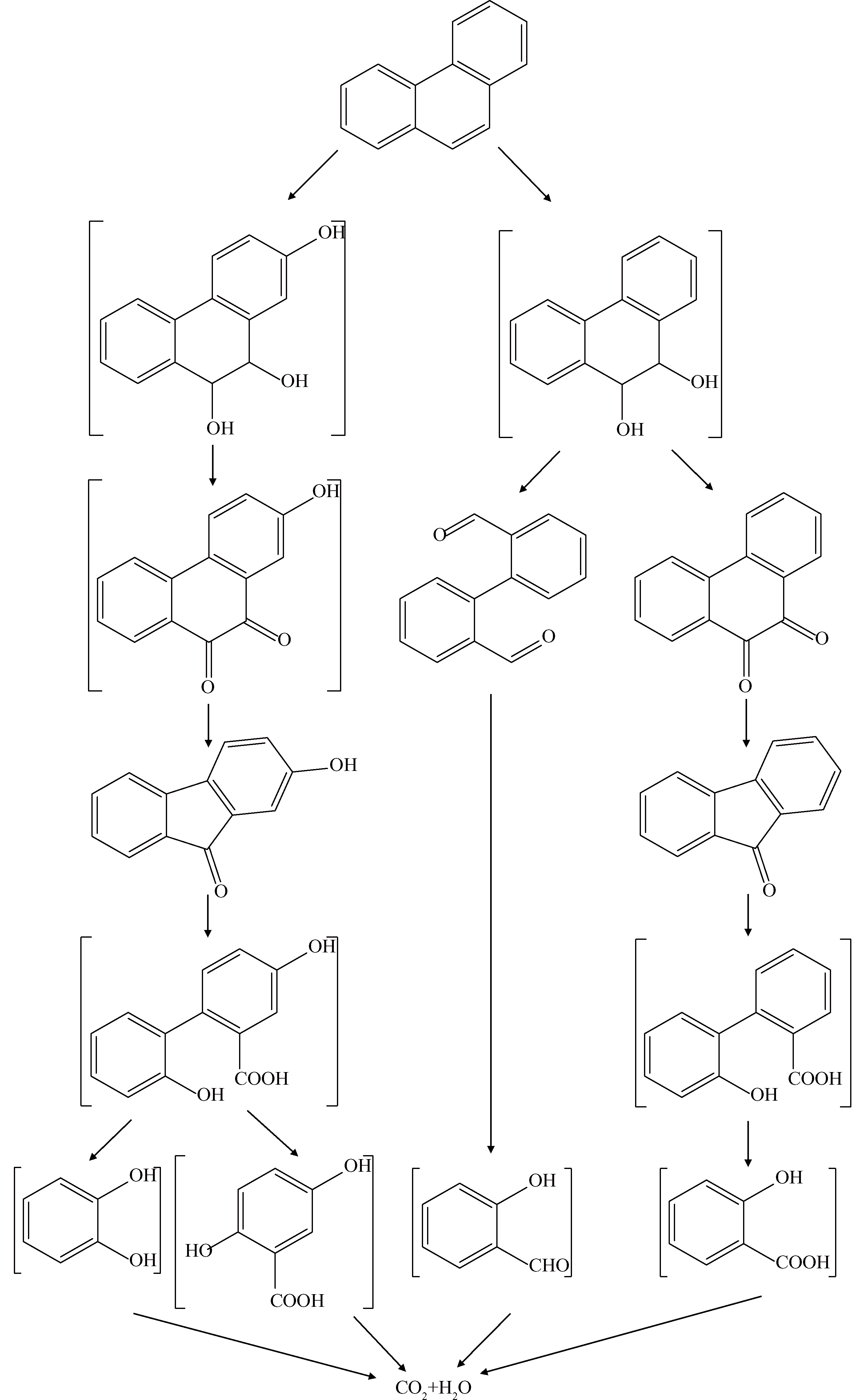 2)US/Fenton降解Phe的主要產物有9,10菲醌、(1,1′)-二苯基-2,2′-二甲醛、9-芴酮、2-羥基-9-芴,反應體系中·OH首先對菲上的9,10位點進行攻擊,生成醇類有機物,然后會進一步被氧化成醌類有機物,最終礦化成CO2和H2O。