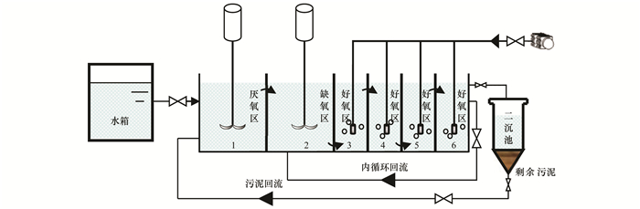 A2/O反應器采用有機玻璃制成, 有效容積為48 L, 其中厭氧區和缺氧區有效容積均為12 L, 好氧區有效容積為24 L.厭氧區和缺氧區均配有攪拌器, 好氧區底部裝有曝氣頭, 采用折流方式運行.裝置內部由隔板分為6部分, 其中1為厭氧區, 2為缺氧區, 3~6為好氧區, 好氧區的混合液回流至缺氧區.采用豎流式二沉池, 容積為5 L. A2/O工藝連續運行, 污泥回流比為50%, 硝化液回流比為100%; MLSS為4 000 mg·L-1, HRT為8 h, 溫度為17~23℃. A2/O工藝流程如圖 1所示.